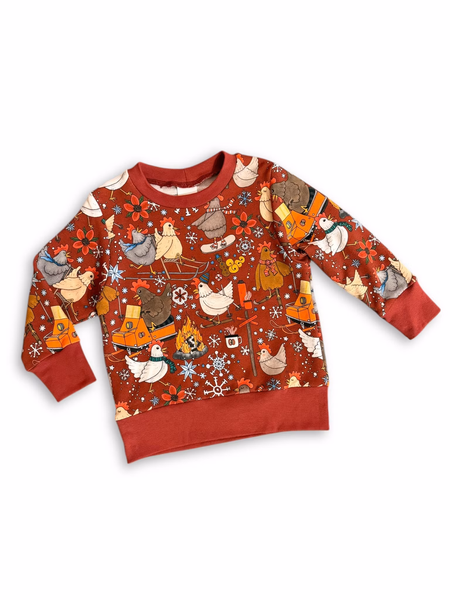 Collegetröja till barn, sydd i tunn ekologisk jogging med hönor som utövar vinteraktiviteter, på röd botten.