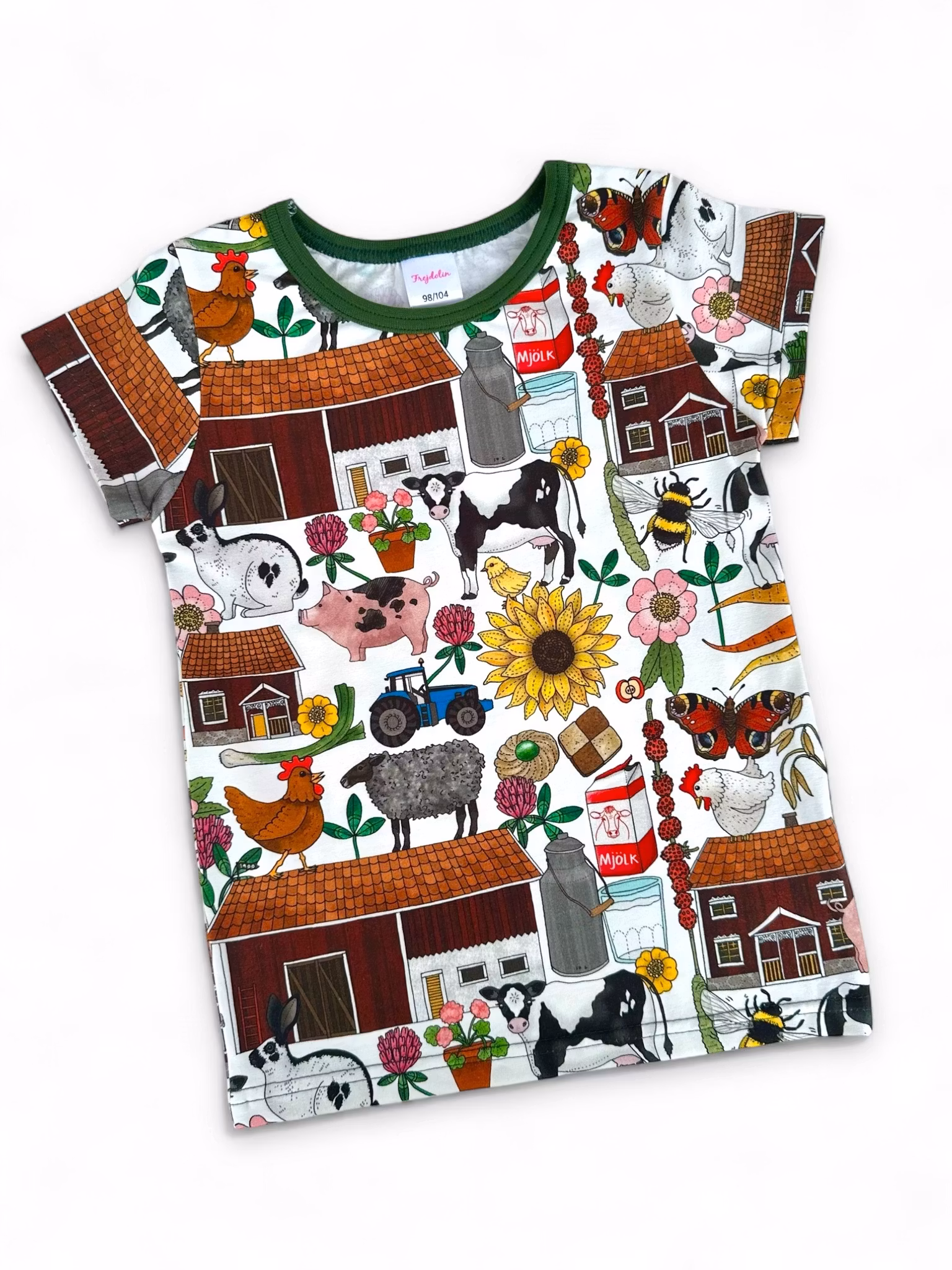 T-shirt till barn, sydd i trikå med bondgårdstema på vit botten.