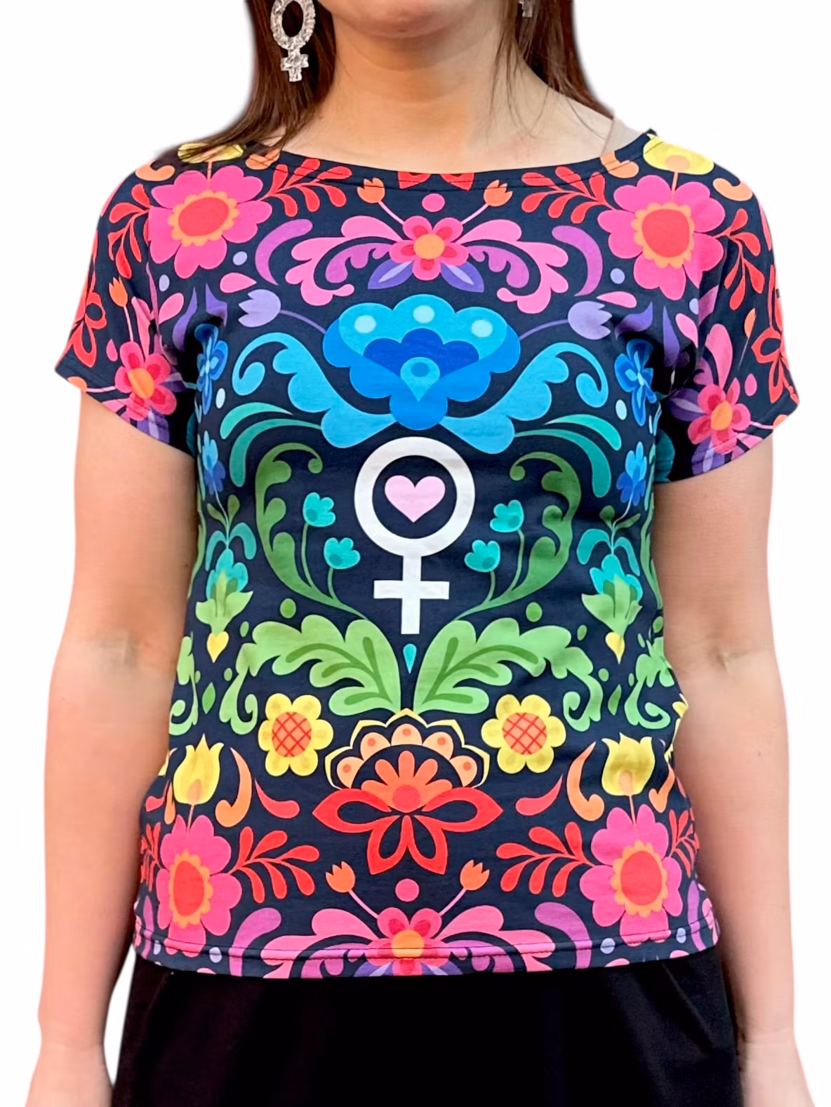 Vuxen topp, sydd i trikå ”feministkurbits”.
